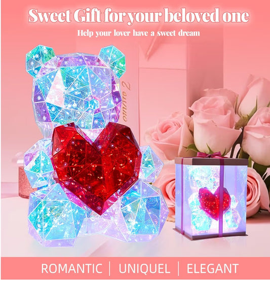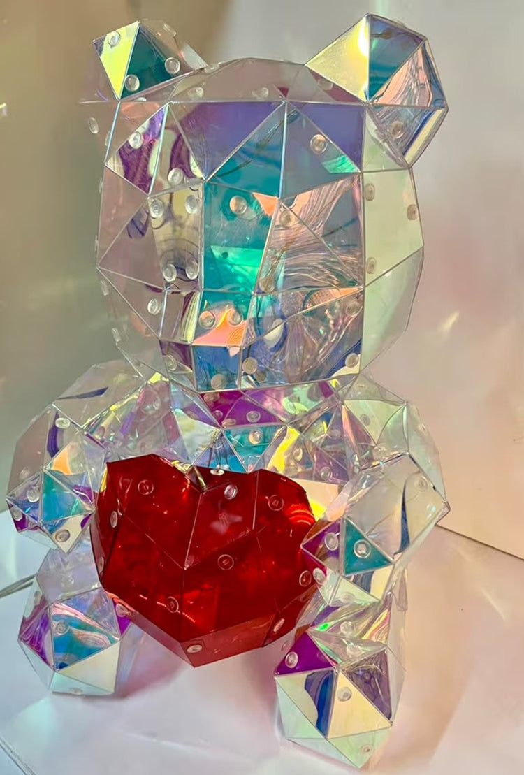 LED Light Up Bear Holographic Iridescent Lights Gift Low Poly Heart Bear Decoration Lights Led Lights Colorful Holiday Lighting Decorations USB Plug with QR Phone Control.(6x5x4.5)